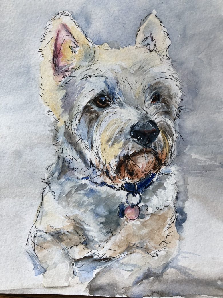 This is an exciting new painting workshop for those who are beginners or have painted before. You can paint your own pet or do this charming picture of Louis, either way I will give you lots of advice on drawing initially and then how to pen in detail and finally how to use the right colour palette for your own pet. If you don’t have a pet I’m happy for you to bring another animal, but it must be a portrait.
